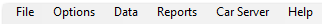 The Menu Bar includes the File, Options, Data, Reports, Car Server and Help Menus. These menus provides all the needed tools to manage options, setup parameters and perform basic administrative tasks.