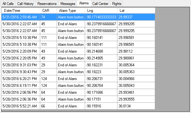 The Alarms Table displays in rows all the incoming alarms signals that the call center receives from the drivers tablet.